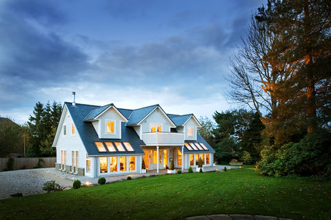 this architect designed house near Edinburgh looks stunning lit up inside against a setting sun sky